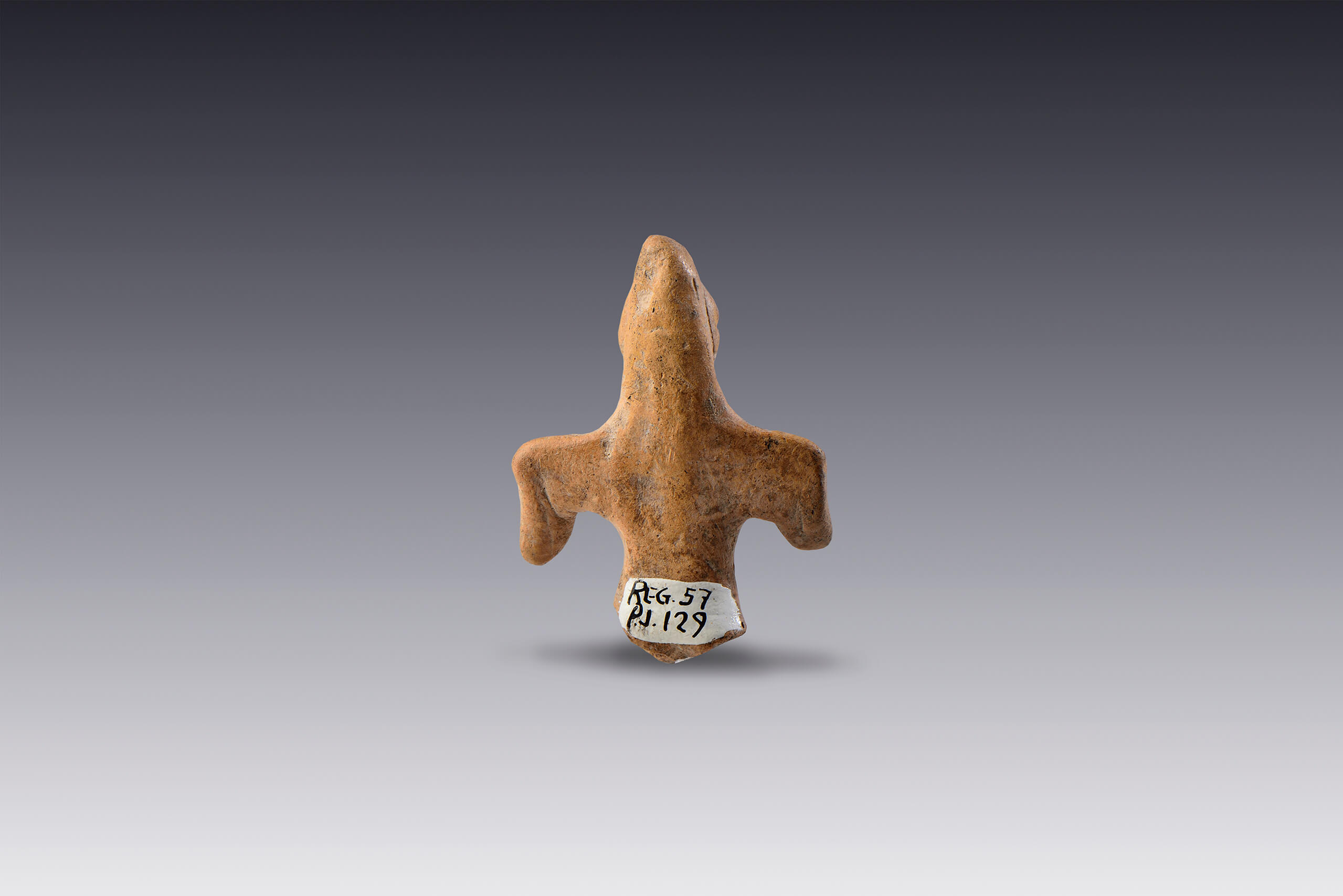 En estos siglos en los que se conforman los elementos culturales prehispánicos, la interpretación plástica del cuerpo humano resulta ser diversa en la manera de elaborarse. Un ejemplo de ello es esta pieza. Se trata de una obra elaborada en arcilla modelada con aplicaciones e incisiones que definen al personaje. Pese a no contar con las extremidades inferiores, el tronco permite advertir su abultado vientre y sus pechos, lo que sugiere una figura femenina embarazada. No obstante, lo más llamativo de este estilo escultórico es la cabeza plana y triangular, lograda por medio de la digitación que se complementa con aplicaciones en forma de círculos que, junto a incisiones rectas, crean los ojos y la boca semiabierta.