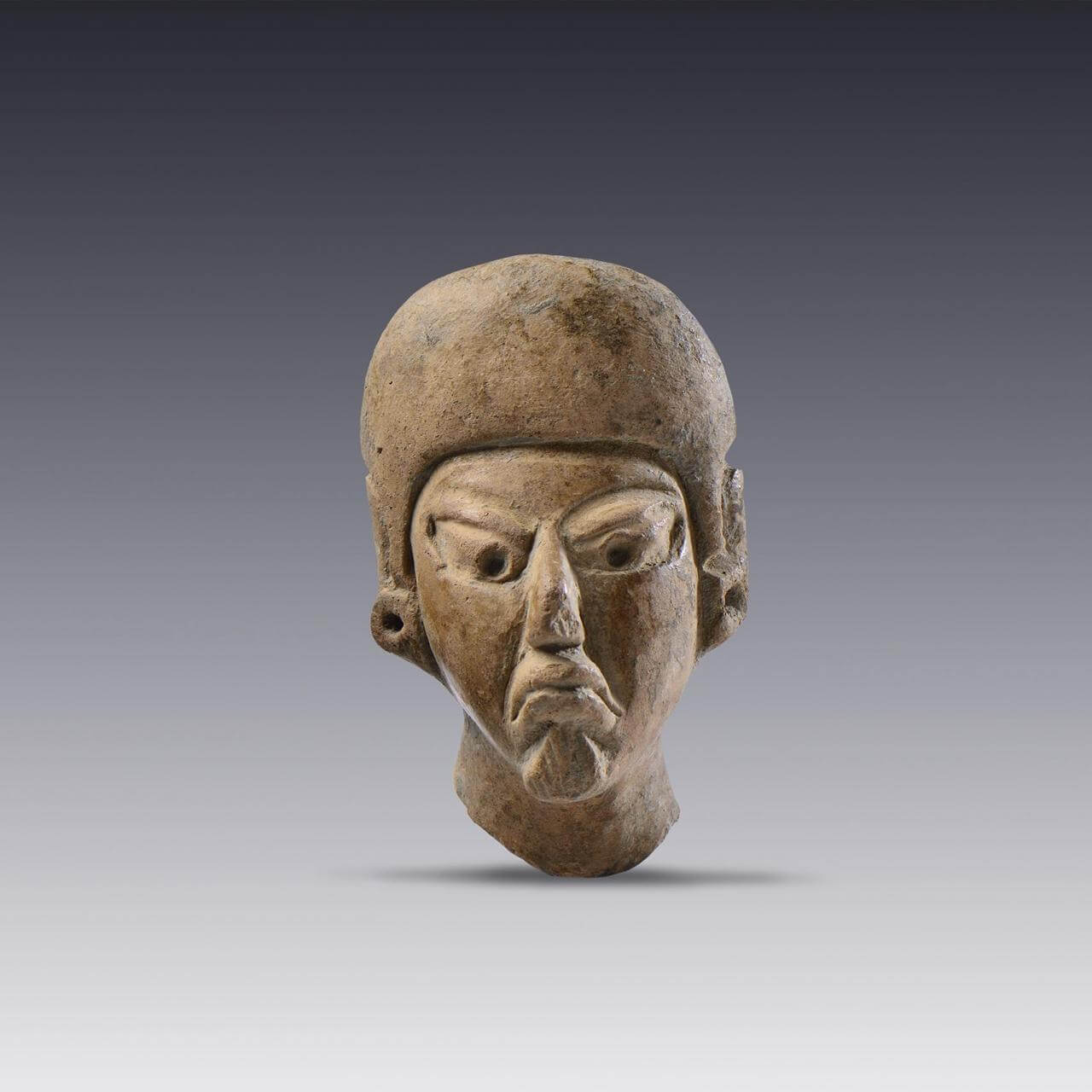 Arte prehispánico Cabeza masculina con tocado tipo casco y orejeras Esta pieza corresponde a la cabecita de una figurilla masculina elaborada en barro de color café claro. Fue trabajada con la técnica de ...