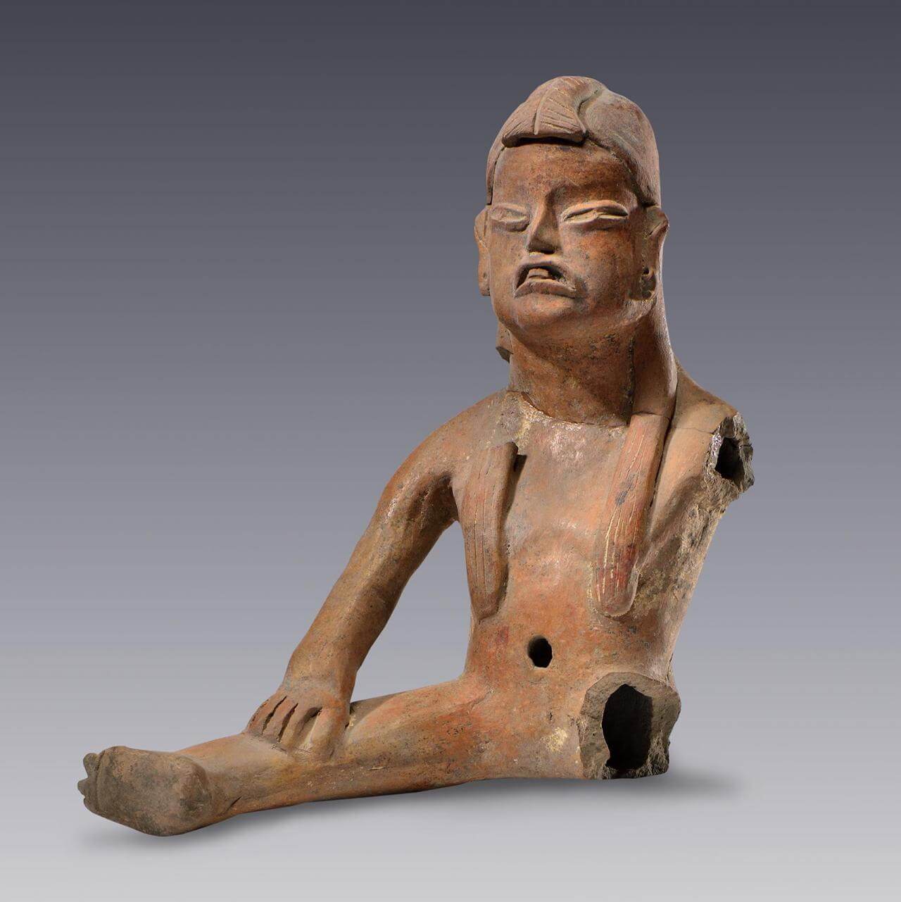 Arte prehispánico Figura humana sedente con peinado elaborado Esta pieza evidencia la creativa atención en los detalles de la escultura cerámica modelada en pequeño formato por parte de la so ...