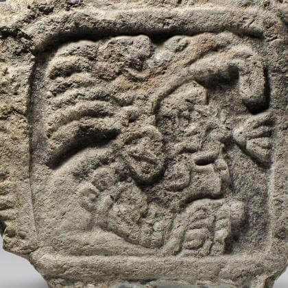 Arte Prehispánico Deidad con tocado de ave Anciano de perfil que cubre su cabeza con un tocado de rostro antropomorfo y adornado con plumas en la parte posterior. Pese al deterioro de la piedra ...